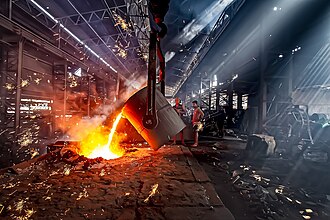 | Title | Metallurgical furnace in operation inside an industrial foundry in Guwahati, Assam, India, showing molten metal being poured and workers engaged in the smelting process. |