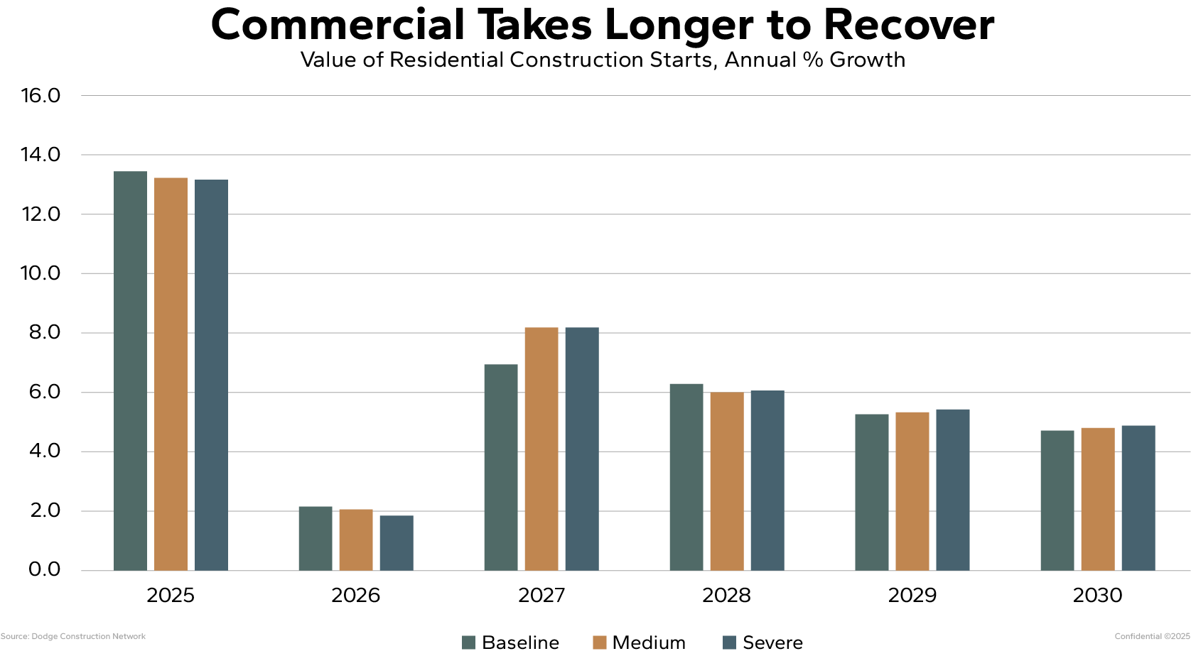 Chart 3 shows that while few institutional projects are expected to be abandoned outright, many will experience delays as planning teams and funding processes restart. Dodge anticipates a long, slow climb back, with institutional starts not fully recovering until the end of the five-year forecast horizon.
