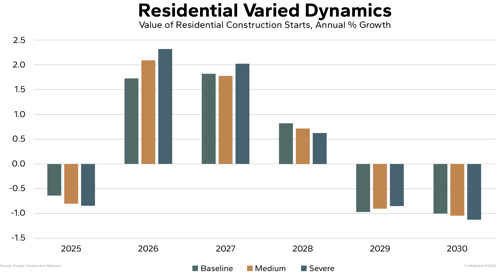 The residential sector, particularly single-family housing, is expected to react first. Dodge’s models show a mild dip in growth for 2025 as public housing projects stall, followed by a strong rebound in 2026 once activity resumes.