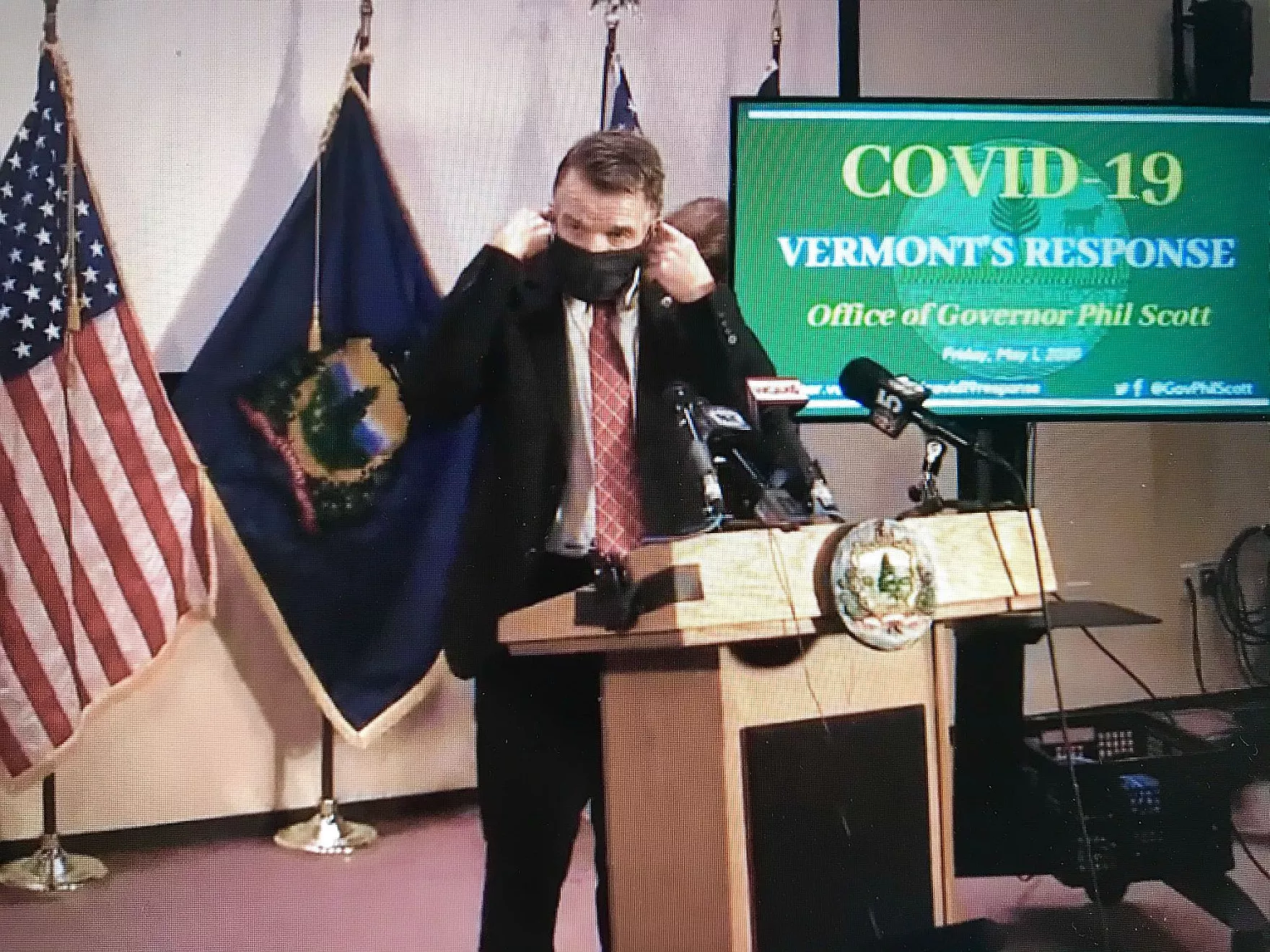 Gov. Phil Scott removed his cloth mask at a press conference Friday, where he said tens of thousands of employees in the manufacturing and construction sectors will soon be allowed to return to work.