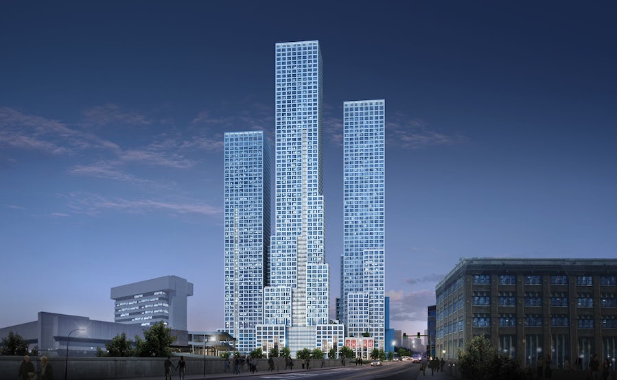 Construction of the second Journal Squared mixed-use complex tower (center) in Jersey City, set to finish by year-end, faces a state-ordered shutdown as a non-essential project to curb COVID-19 spread; the order takes effect April 10. Rendering: HKWN/KRE