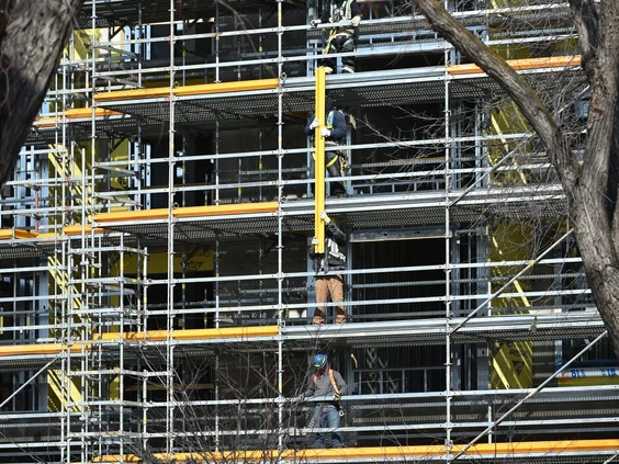 (Construction workers working in unison on scaffolding, on a apartment and commerical building site underconstruction along Whyte Avenue in Edmonton on Thursday, March 19, 2020.)