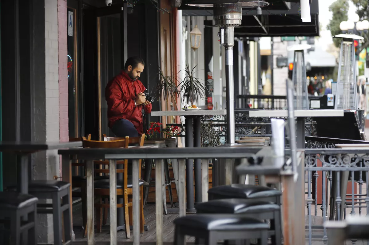 (Surinder Singh, owner of Urban India restaurant in San Diego, with no customers in sight on March 17, a day before San Diego County banned dine-in eating at restaurants.)