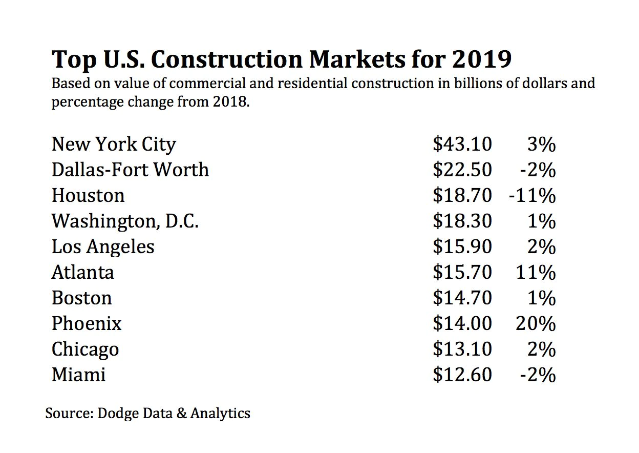Only New York City had more total construction — both residential and nonresidential — than the D-FW area, according to information from Dodge Data & Analytics.