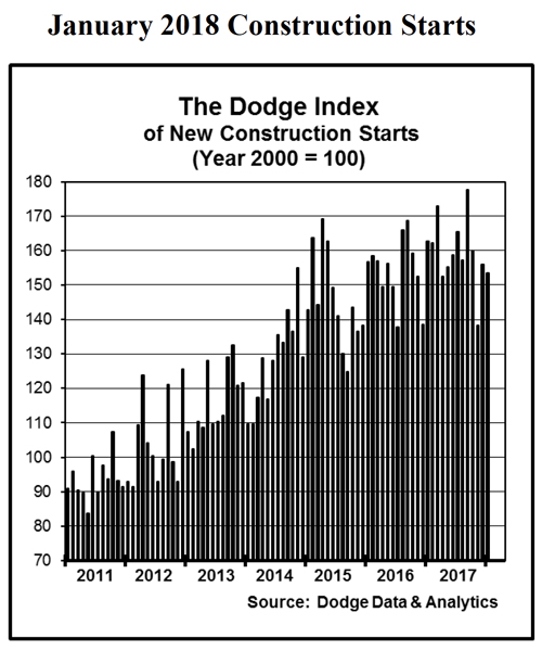 The 7% decline for total construction starts on an unadjusted basis for January 2018 relative to January 2017 was the result of a mixed performance by major sector. Nonbuilding construction increased 4%, with public works up 6% while electric utilities/gas plants dropped 6%. Nonresidential building fell 20% from a very strong January 2017 which included such unusually large construction starts as the $3.6 billion Central Terminal Building replacement project at LaGuardia Airport in New York NY, the $600 million McClellan Business Park data center in McClellan CA, and a $477 million terminal project at San Francisco International Airport. Compared to the same month a year ago, the institutional and commercial building segments of nonresidential building were down 23% and 21% respectively, while manufacturing plant starts advanced 18%. Residential building rose 1% from the same month a year ago, with single family housing up 3% while multifamily housing slipped 2%. By geography, total construction starts for January 2018 relative to January 2017 registered this pattern – the Northeast, down 36%; the West, down 10%; the South Central, down 9%; the South Atlantic, unchanged; and the Midwest, up 42%.